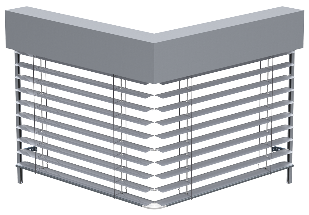 You no longer need to be limited by corner windows when it comes to outdoor blinds. Until now, it was a problem to shade corner windows without the guide rail obstructing the view. Our new revolutionary corner outdoor blinds in a coupled design connect the slats using a stainless steel ball chain in a plastic guide. A metal angle piece inserted in the plastic corner then solves the connection of the bottom rail profiles. Both blinds are driven together by a single motor.