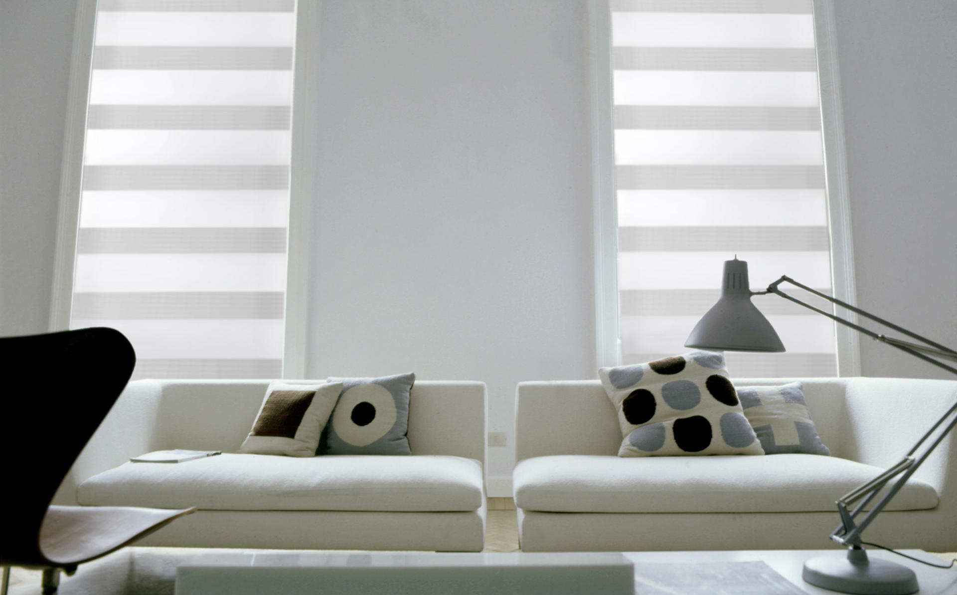 Thanks to their simple appearance, day-and-night roller shutters can easily be integrated into minimalist interiors as well as cosily furnished rooms. The range of fabrics includes various colours, structures and stripe widths, so it is possible to match the roller shutter with furniture, wall colour or, conversely, use it as a more distinctive decorative element.